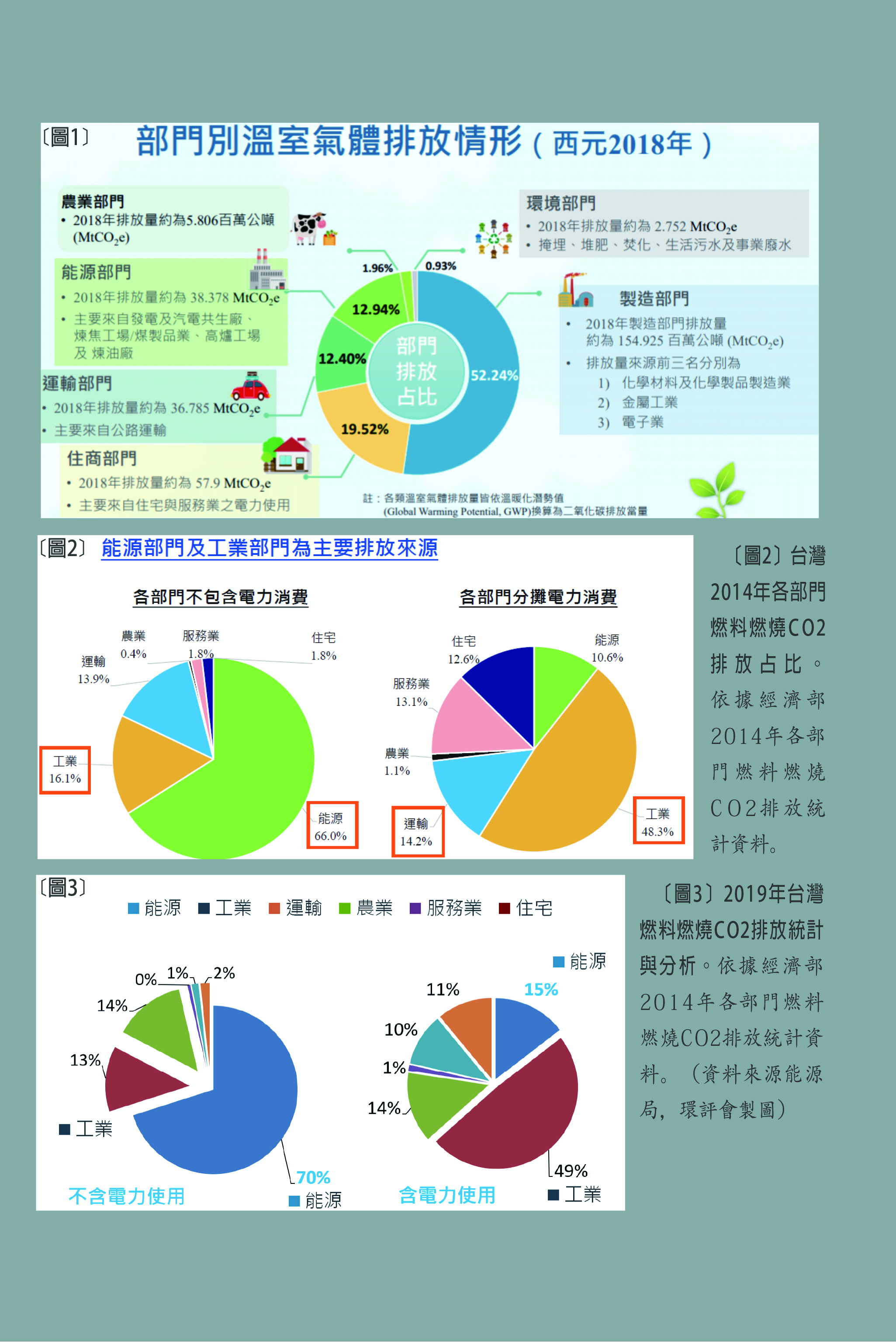 對比2016年1月環保署「未來『國家綠能低碳總行動方案』推動規劃及105(2016)年度工作計畫」(〔圖2〕,見封底裡),就可以看出直接排放與間接排放的差異(能源部門排放量從66%降低為10.6%,製造部門從16.1%增加為48.3%)。