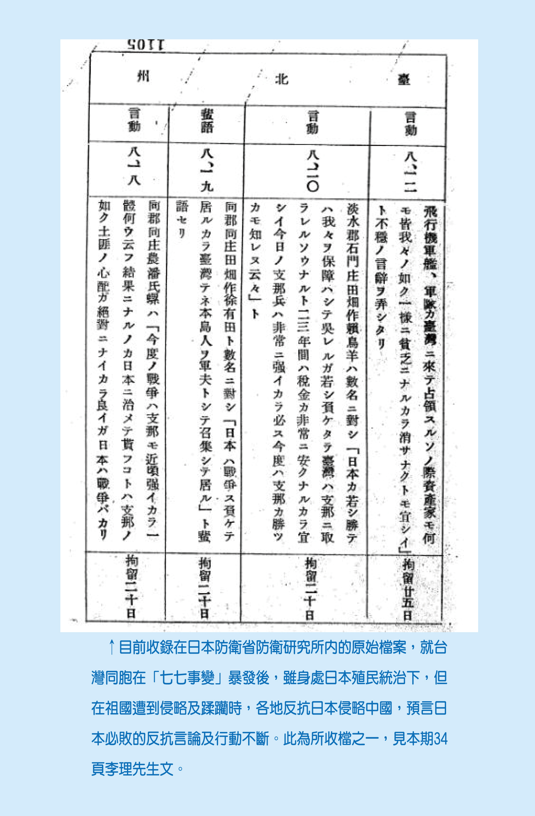 本文以目前收錄在日本防衛省防衛研究所內的原始檔案(見封底裡),就台灣同胞在「七七事變」爆發後,雖身處日本殖民統治下,但在祖國遭到侵略及蹂躪時,各地反抗日本侵略中國,預言日本必敗的反抗言論及行動不斷。這一史實充分彰顯台灣人民不滅的中國魂。