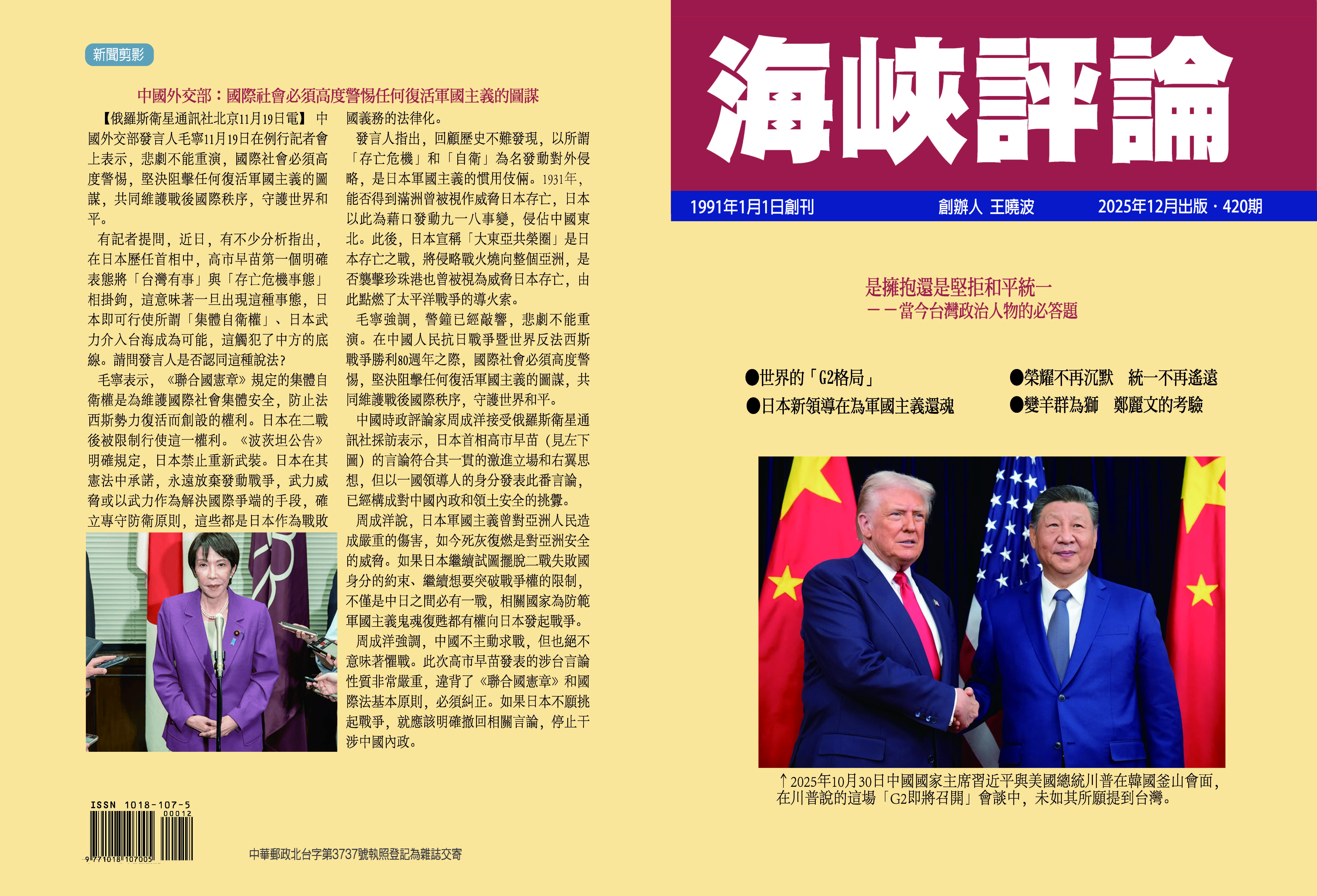 1987年蔣經國宣佈解嚴後,本誌創辦人王曉波指出此後台灣的主要矛盾是統與獨。今(2025)年10月30日,習近平與川普在韓國釜山會晤,川普想談台灣問題,習近平則未像2023年11月在舊金山請當時總統拜登那樣請川普「支持中國的和平統一」,過了那個村就沒了那家店,此次會晤標誌著和平統一已不干美國的事,然而也就在此時,美國智庫蘭德公司建議川普政府公開反對台獨,支持中國漸建式的和平統一。台灣的主要矛盾也因此由統獨轉向是擁抱還是堅拒和平統一。